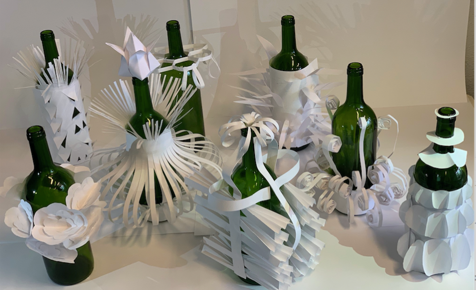 Un caviste demande aux élèves d’habiller ses bouteilles de vin afin de réaliser la scénographie de sa vitrine en boutique. Il souhaite de l’extravagance, du blanc, du volume et de l’audace !
