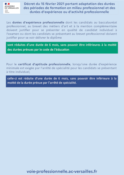 Le décret du 2021-161 du 15 février 2021 réduit, pour la session d’examen 2021, des durées de périodes de formation en milieu professionnel et des durées d’expérience ou d’activité professionnelle exigées des candidats, en conséquence de l’épidémie de covid-19.