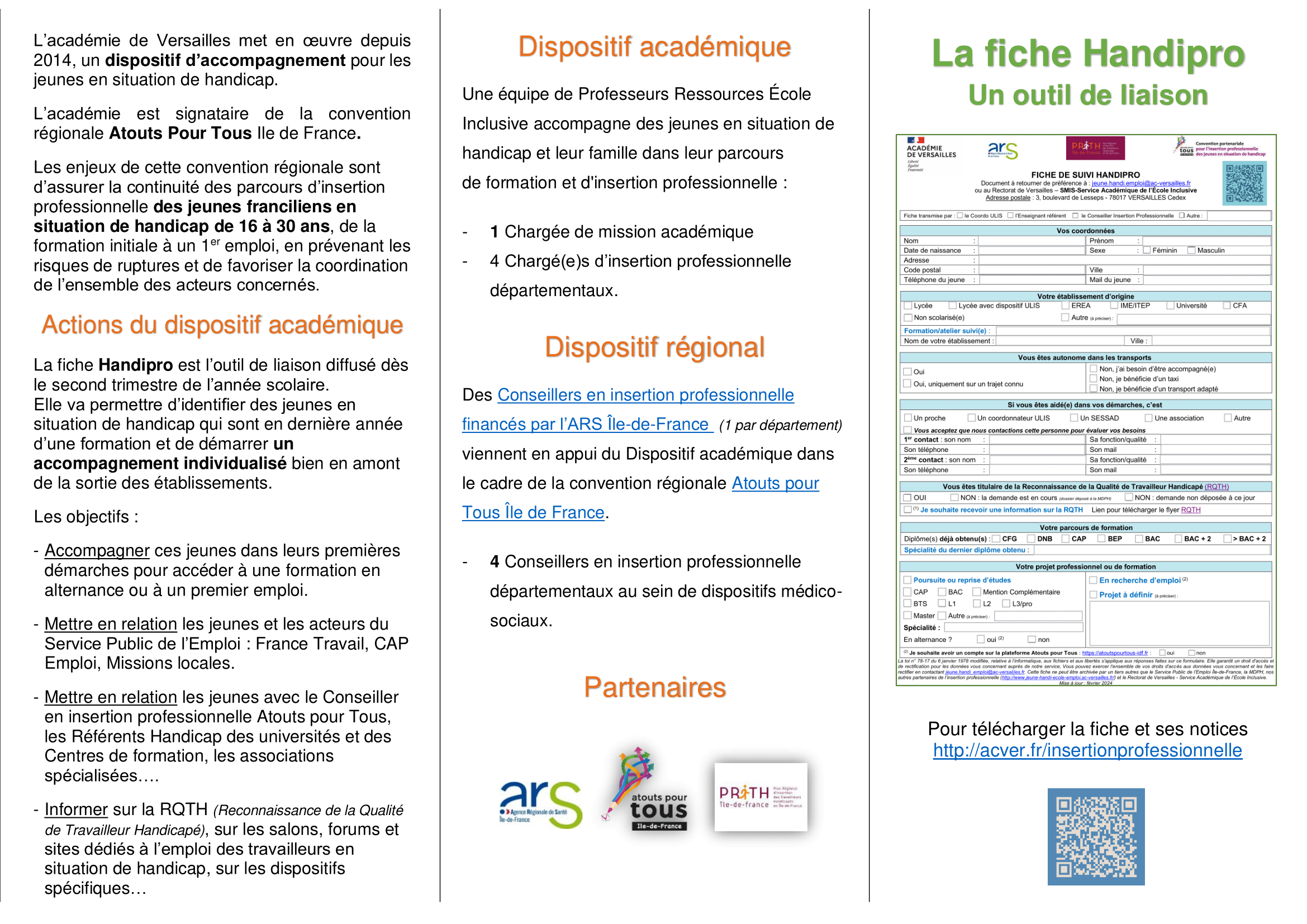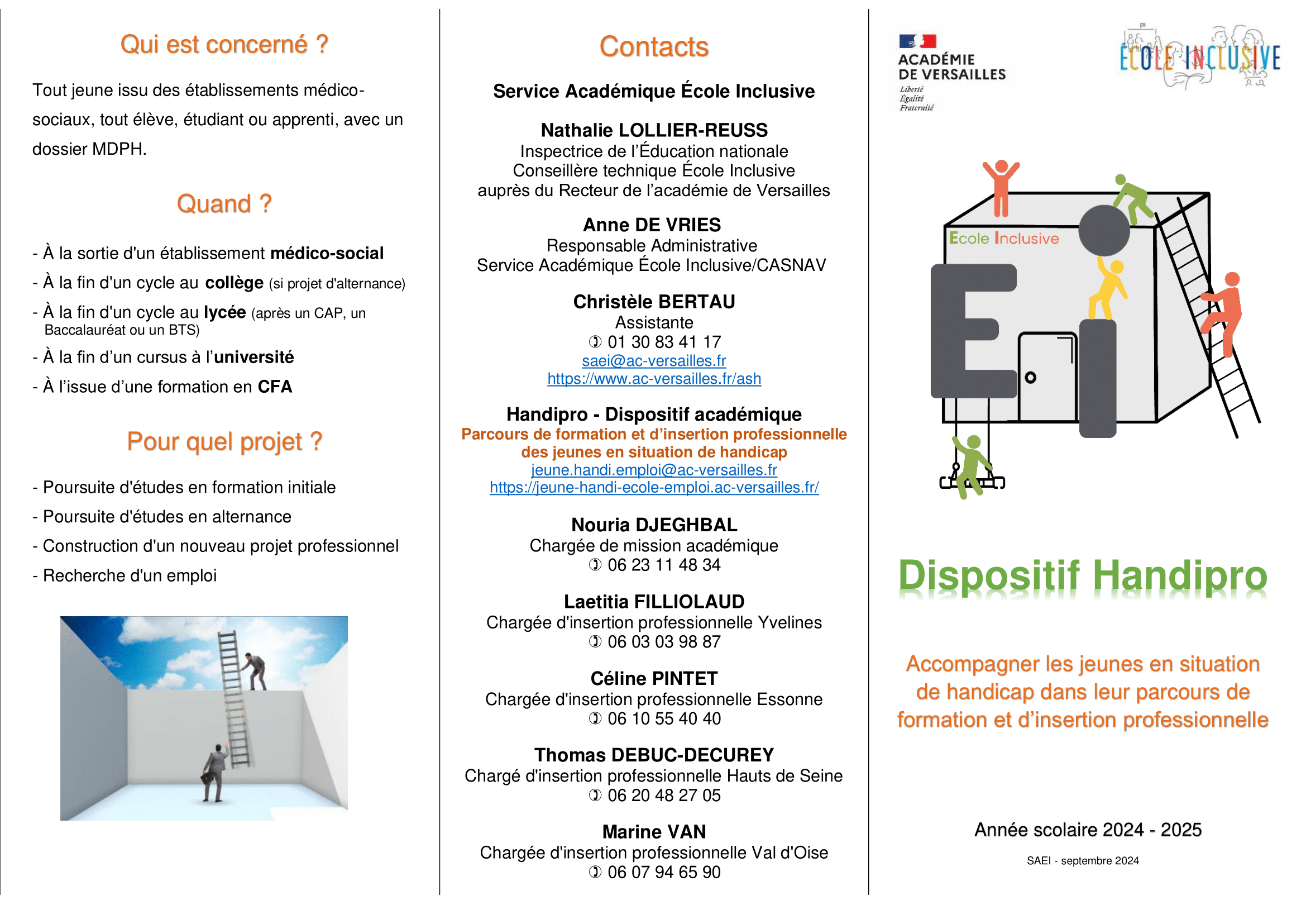 Dans le cadre de sa politique nationale en faveur de l’école inclusive et de l’accompagnement des élèves à besoins éducatifs particuliers, l’Académie de Versailles propose diverses ressources ainsi qu’un dispositif d’accompagnement destiné à soutenir les acteurs de la communauté éducative. Cela concerne les lycées professionnels, les CFA publics et les établissements médico-sociaux offrant des formations reconnues par l’Éducation Nationale.