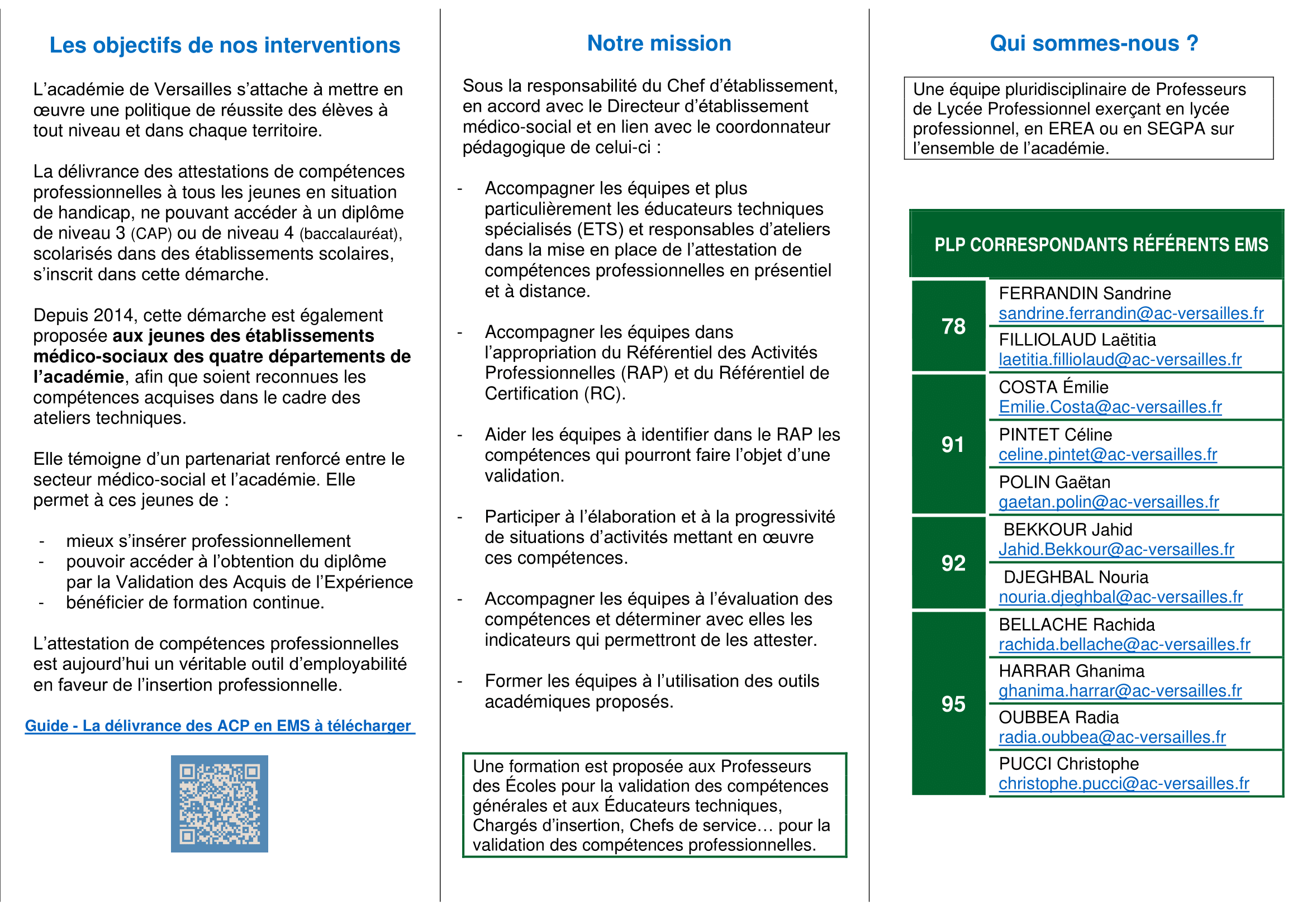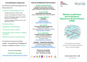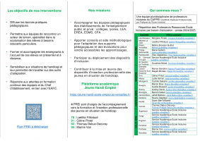Les flyers ci-joints détaillent deux ressources et un dispositif : Professeurs Ressources École Inclusive (PREI), les Professeurs de Lycée Professionnel Correspondants EMS (établissements médicaux social et ressources attestations de compétences professionnelles Inclusive (PREI), et le Dispositif Handipro.