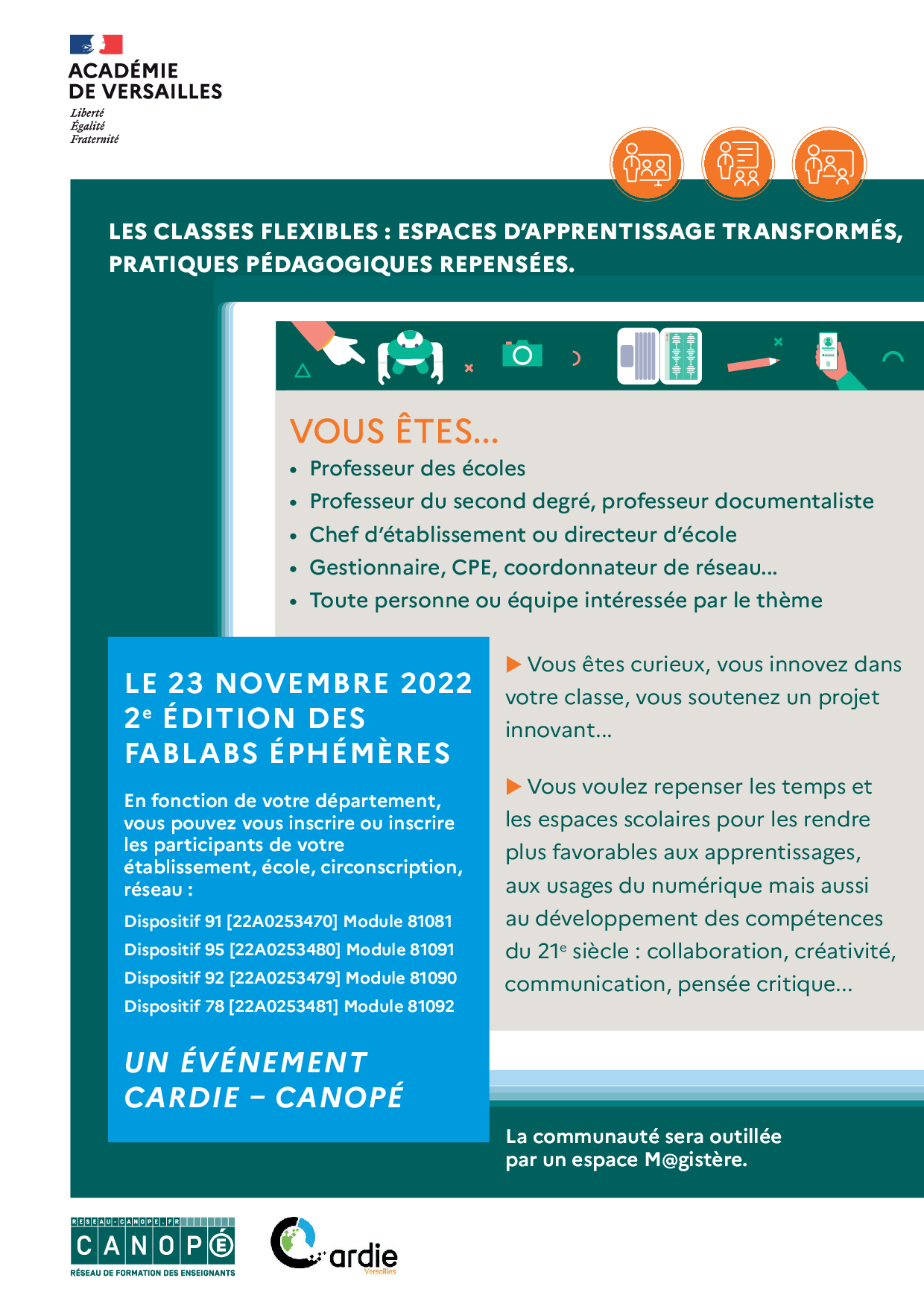La Cardie et les ateliers Canopé de l’académie de Versailles leur proposent de venir partager leurs idées, de construire leur projet au sein de la communauté professionnelle des classes flexibles.
