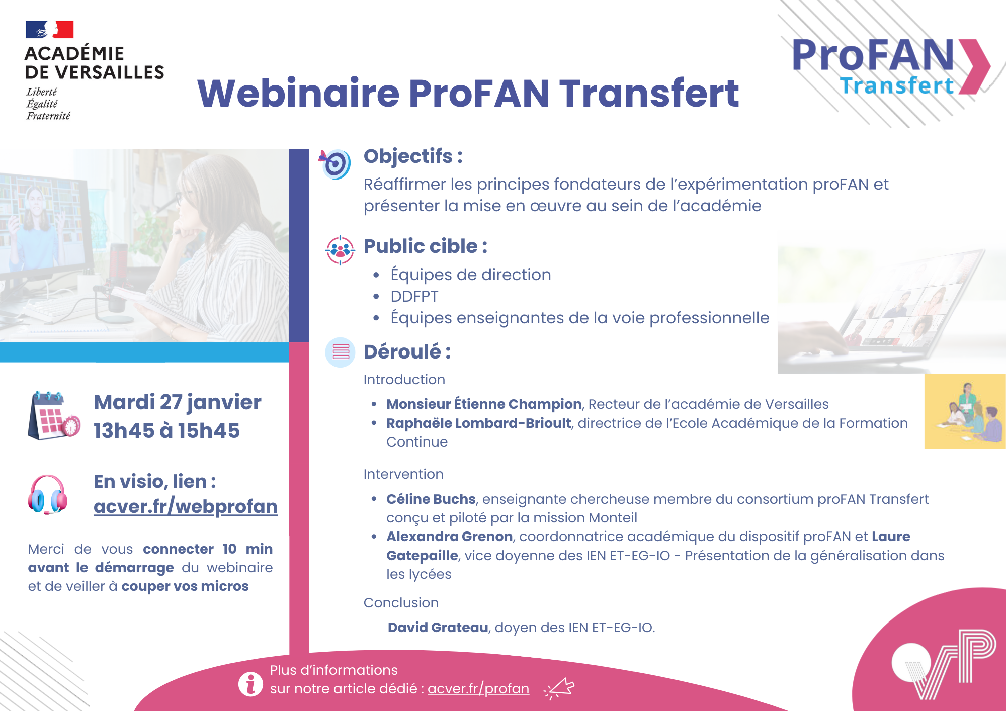 L’académie vous a invité à un webinaire ProFAN Transfert le mardi 27 janvier 2026 de 13h45 à 15h45.